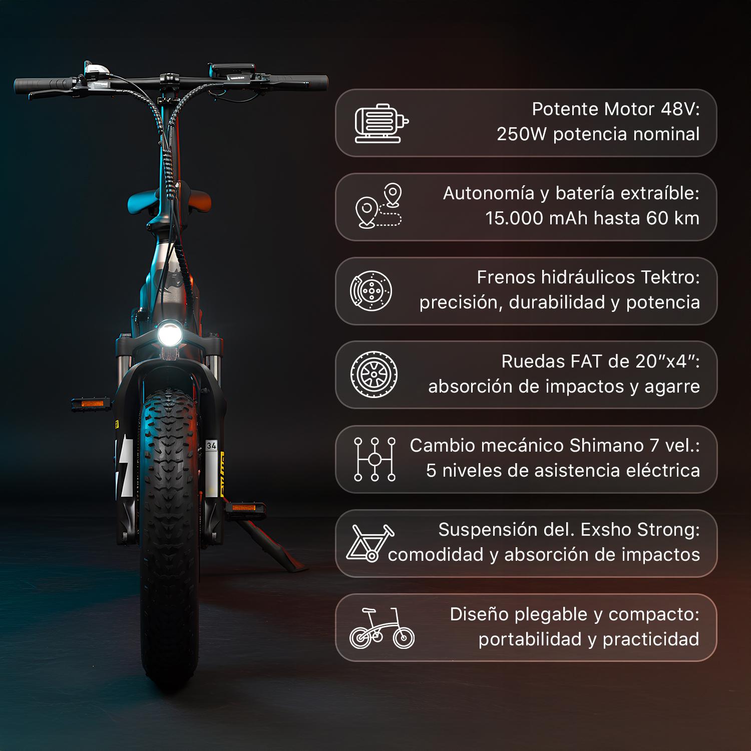 Bicicleta eléctrica de montaña con asistente al pedaleo, motor de 250W 48V, batería de 15Ah, 7 velocidades, plegable, frenada hidráulica, Horquilla Exsho, Autonomía de más de 60 km y cuadro de aluminio smartGyro Ebike FAT.